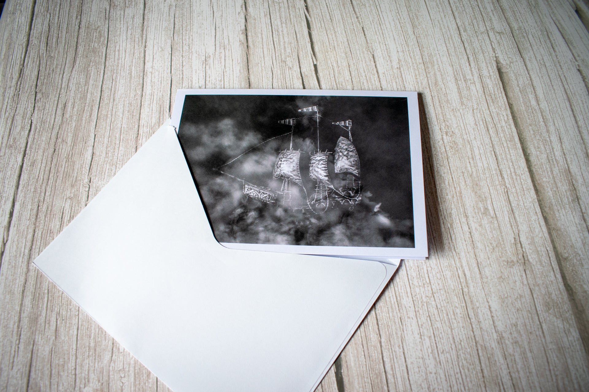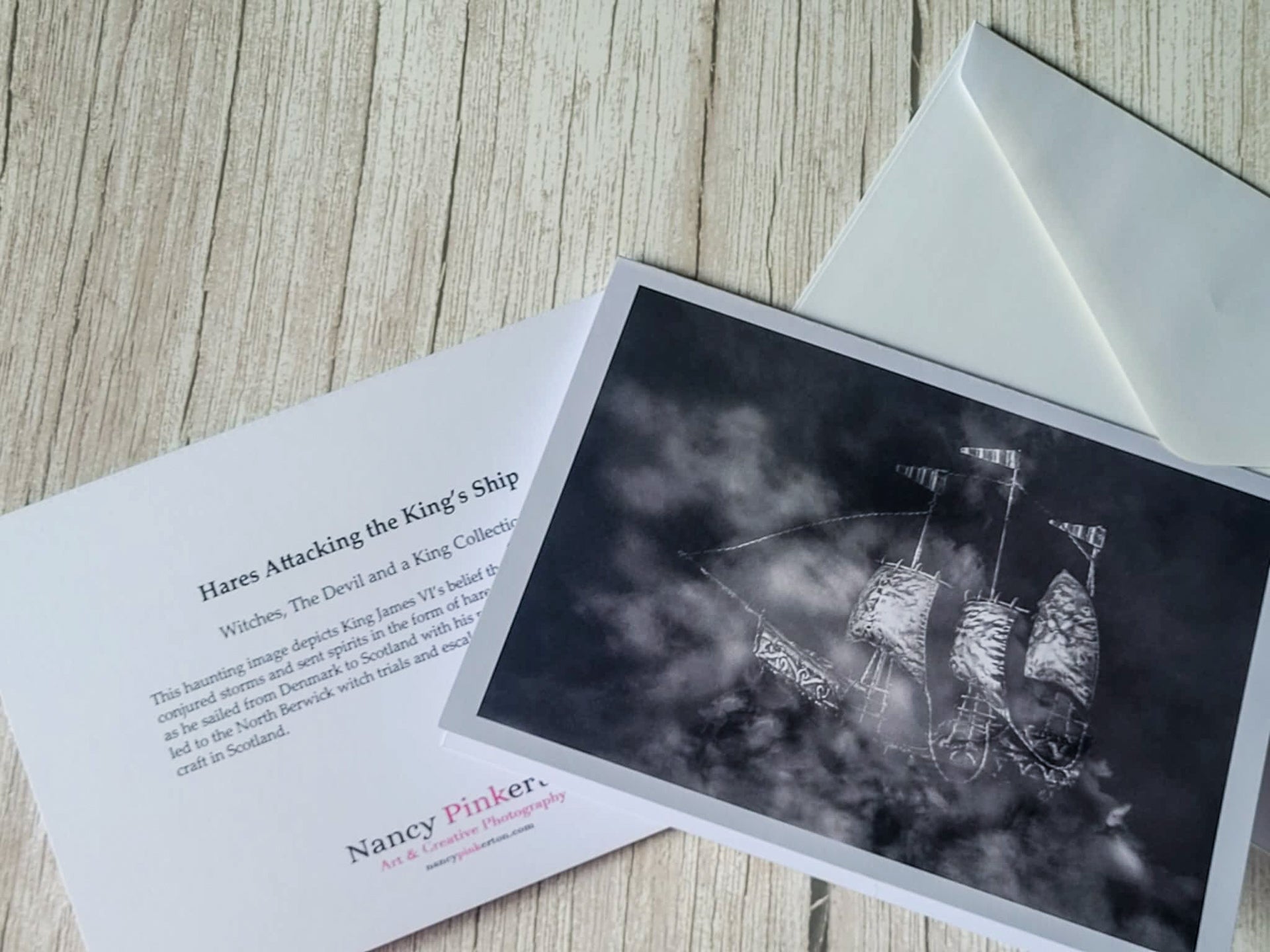 Discover a captivating set of greeting cards from the "Witches, the Devil and a King" collection, which delves into the dark and tumultuous era of James VI, King of Scots. Each card features striking black-and-white imagery, enhanced by ethereal smoke effects that evoke an atmosphere of mystery and intrigue.